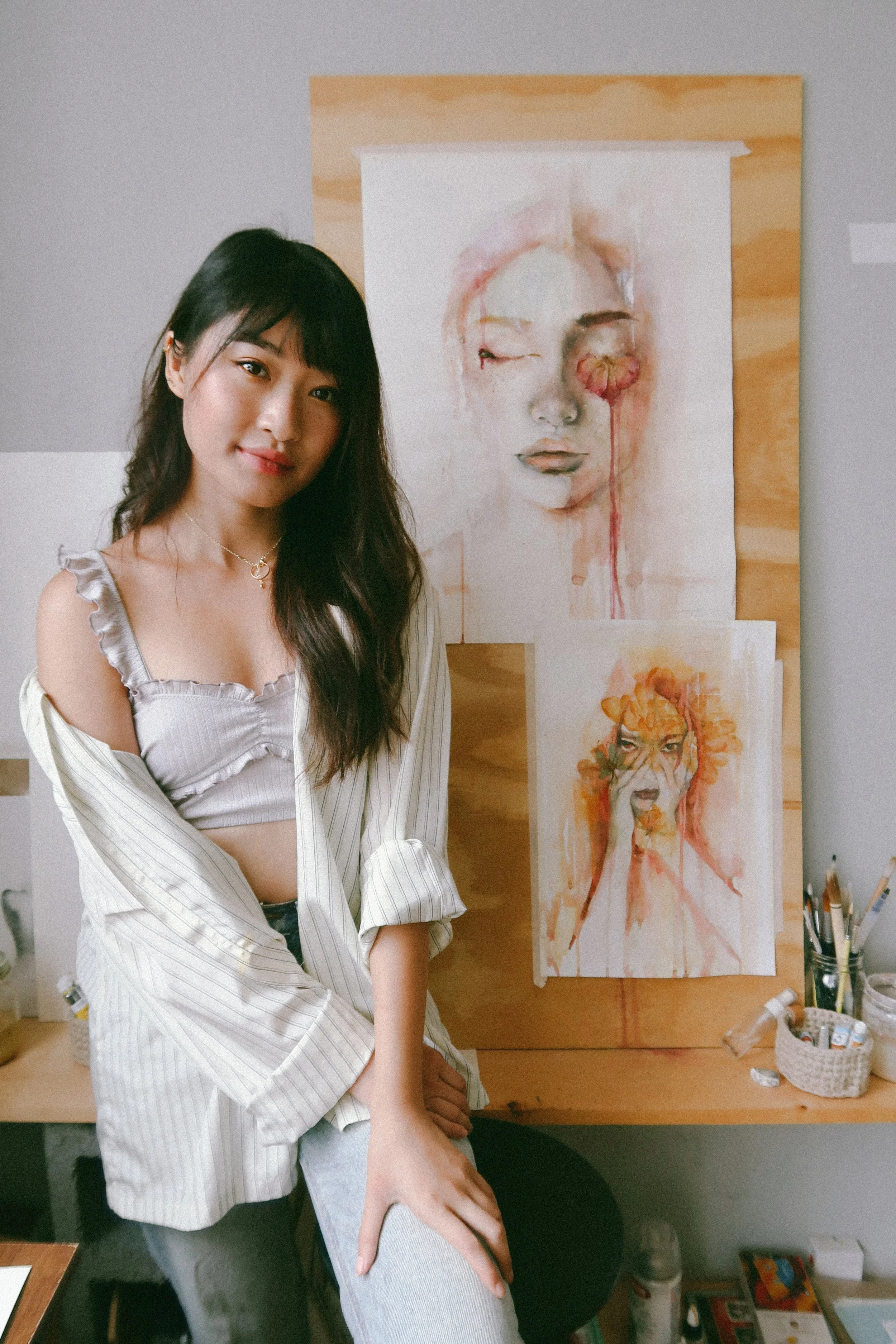 bud & bloom. charcoal, watercolors, acrylic, flowers. 18x24”. 2022.